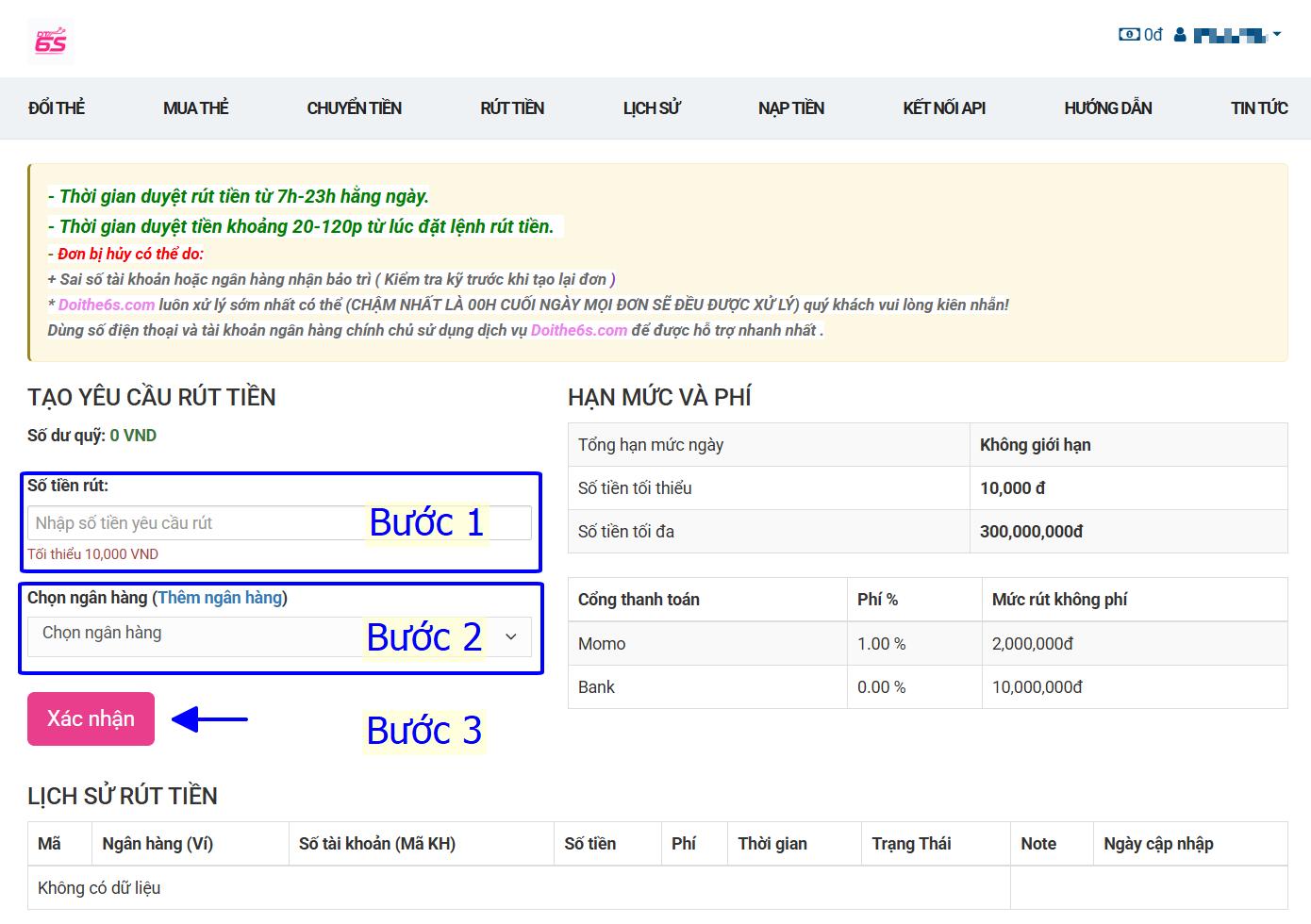 Làm theo hướng dẫn trong ảnh và tiến hành rút tiền về ngân hàng hoặc ví điện tử momo, thời gian xử lý thường chỉ trong khoảng 20 phút.