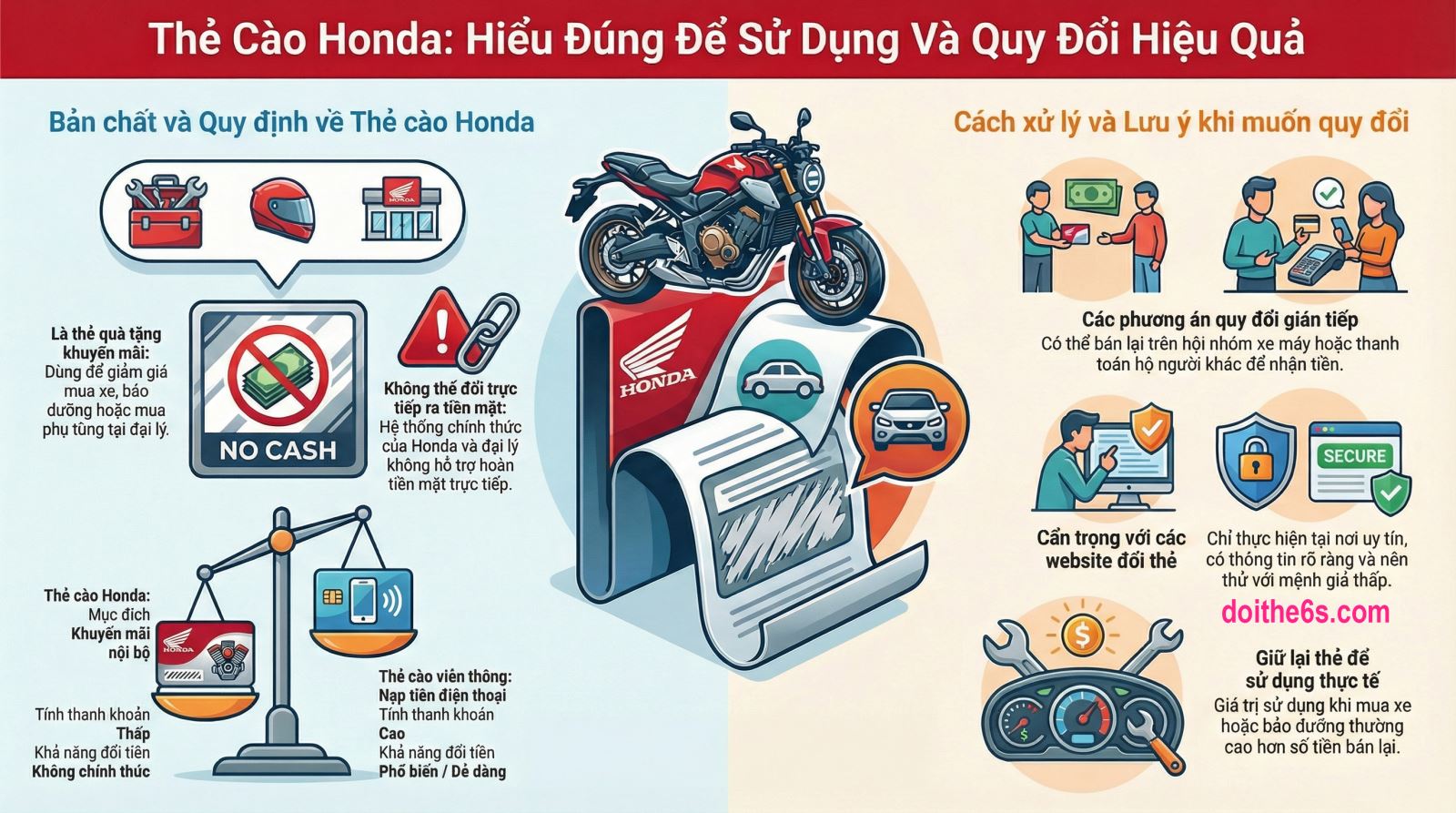 Nhiều người thắc mắc liệu có thể đổi thẻ cào Honda thành tiền mặt hay không, đặc biệt khi nhận được thẻ từ chương trình khuyến mãi hoặc sự kiện. Bài viết dưới đây sẽ phân tích rõ bản chất thẻ cào Honda, khả năng quy đổi, rủi ro tiềm ẩn và giải pháp phù hợp nếu bạn đang muốn đổi thẻ cào honda ra tiền mặt.